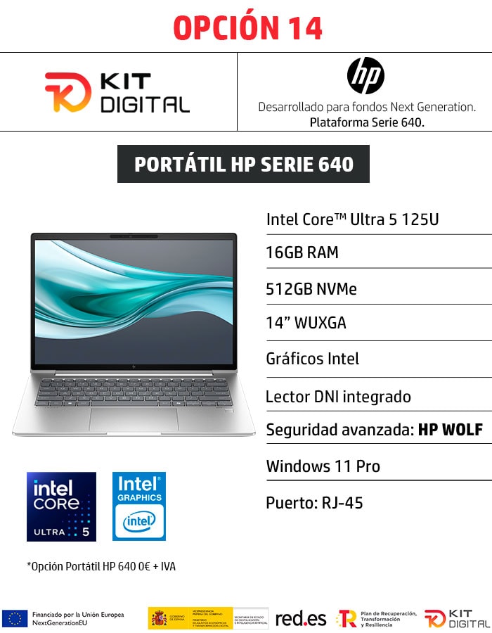 | Portátil | HP serie 640 | Intel Core Ultra 5 | 16 GB | 512 GB | 14" | GRATIS | 14 |